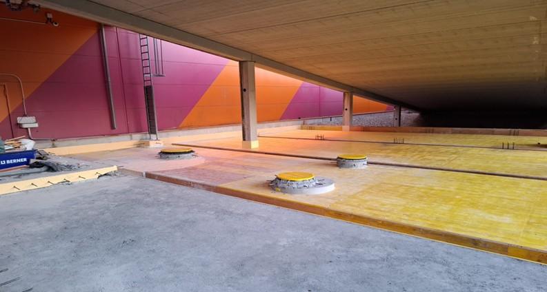 comprenant le terrassement de la zone, la réalisation d’une dalle en béton armé sur pieux battus,