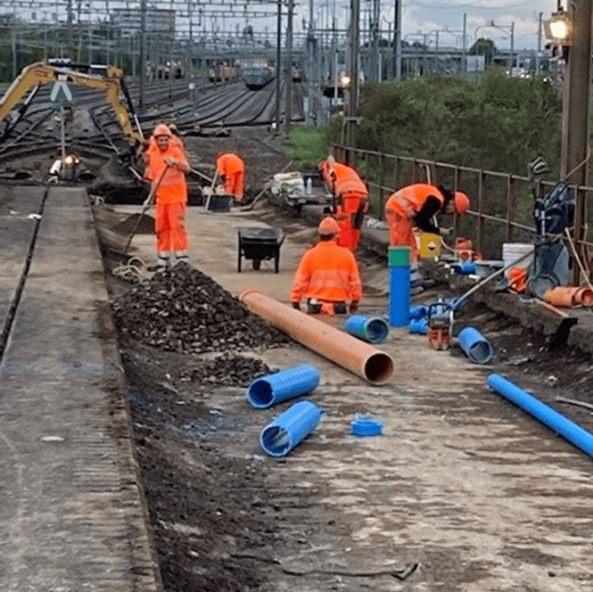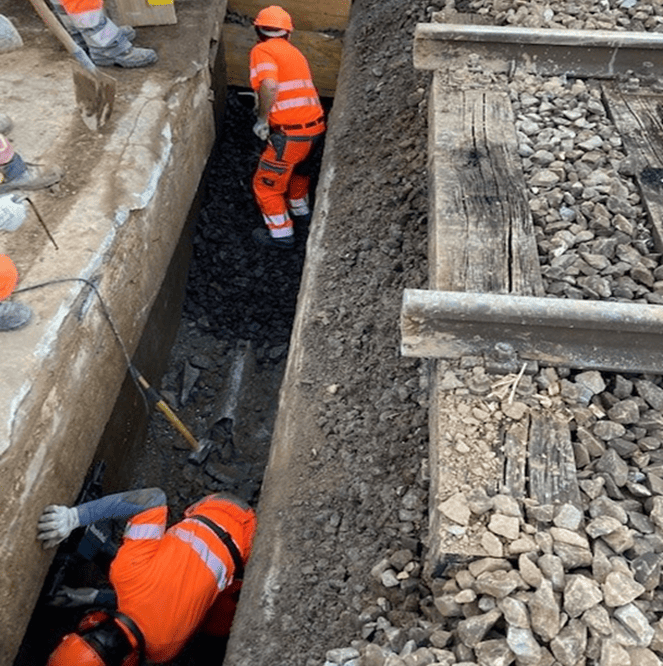 PS de la Poudrière, Bussigny Assainissement Viaduc / travaux de réfection drainage pour des joints culée et tablier Maître de l'ouvrageCFF SAInfrastructure-Projets1001 Lausanne Direction des travaux | IngénieurPerret-Gentil Ingénieurs-civils1401 Yverdon-les-Bains CoûtsCHF 276'000.00 Réalisation2022 Travaux spécifiques Terrassement infrastructure ballast coulée nord/sud d’ouvrage Aspiration ballast dans les joints par camion Nettoyage surface cunette sous haute-pression Pose tuyaux de drainage Mise en place béton cunette Remblayage et pre-ballastage Réalisation Ruglei Quantités Tuyaux de drainage DN 200 mm / 84 m Carottages et sciage du béton DN 150-300 mm Fourniture et pose caniveaux type BK 265 Terassement infrastructure ballast voie B9 tablier / voie A9 tablier Retenu Ruglei 90 m SiègeDe Luca SARue des Prés 332503 Biel/BienneTel. 032 328 70 80info@deluca.ch Succursale MoutierDe Luca SARue des Oeuches2740 MoutierTel. 032 293 10 92moutier@deluca.ch DépôtDe Luca SARue du Lindenhof 222504 Biel/BienneTel. 032 328 70 80depot@deluca.ch Recyclage MatériauxTribel SARue des Oeuches 92740 MoutierTel. 032 493 10 92tribel@deluca.ch EtanchéitéDe Luca Isolations SARue du Lindenhof 222504 Biel/BienneTel. 032 328 70 80depot@deluca.ch